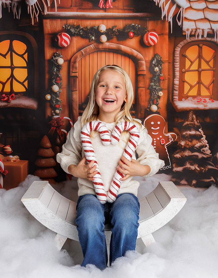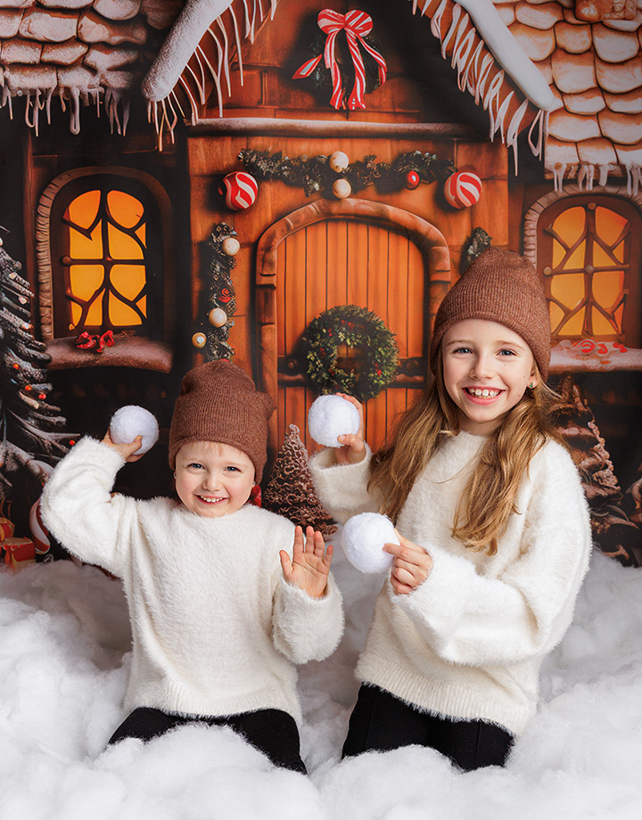 Winterlich dekoriertes Set mit einem Lebkuchenhaus und Schnee